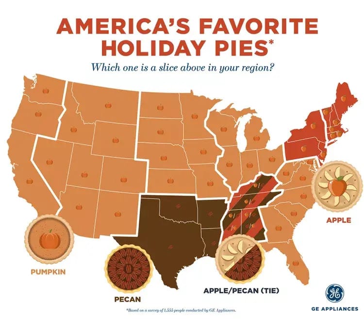 Which pie you get, though, may not just be random. In 2018, General Electric polled more than 1,500 Americans about what type of pie will be at their holiday table. As Food and Wine magazine reported, there were some regional patterns, as seen below.
