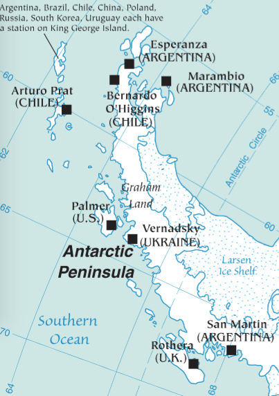 You'll note, though, that there are a lot of different nations making a lot of different claims. The basis for these claims are numerous and often in debate but, by and large, are symbolic anyway. Since 1959, there's been an international treaty in place -- the Antarctic Treaty System -- which governs the icy landmass as far as the treaties' 53 signatory nations are concerned. As are many international compacts, the details of the treaties are complicated, but here are two important ones: nations with pre-existing claims were allowed to assert them, and any signatory nation could set up a research base. Regarding that second point, take, for example, the Antarctic Peninsula, depicted in the inset above. Zooming in, we'll see eight different bases in the region, run by five different nations (excluding those on King George Island):