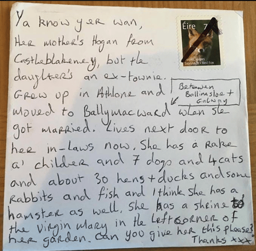 At the time -- this was Christmas, 2016 -- Sheridan was working for An Post, the state-owned postal service in the Republic of Ireland. The address, as you can plainly see, doesn't have a street listed; the only clear clue is that the woman ("yer wan" is Irish slang for "what's-her-face," basically) lives in the village of Ballymacward in County Galway. With nearly 5,000 people there, Postman Sheridan really needed to know his customers if he were to deliver that letter.